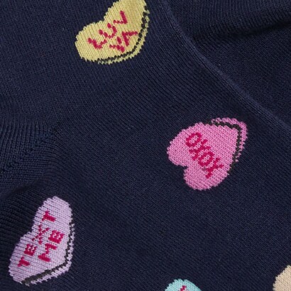 May 24, 2024Fun Valentines Day socks in navy. Pastel conversation hearts pop! Comfortable to wear.